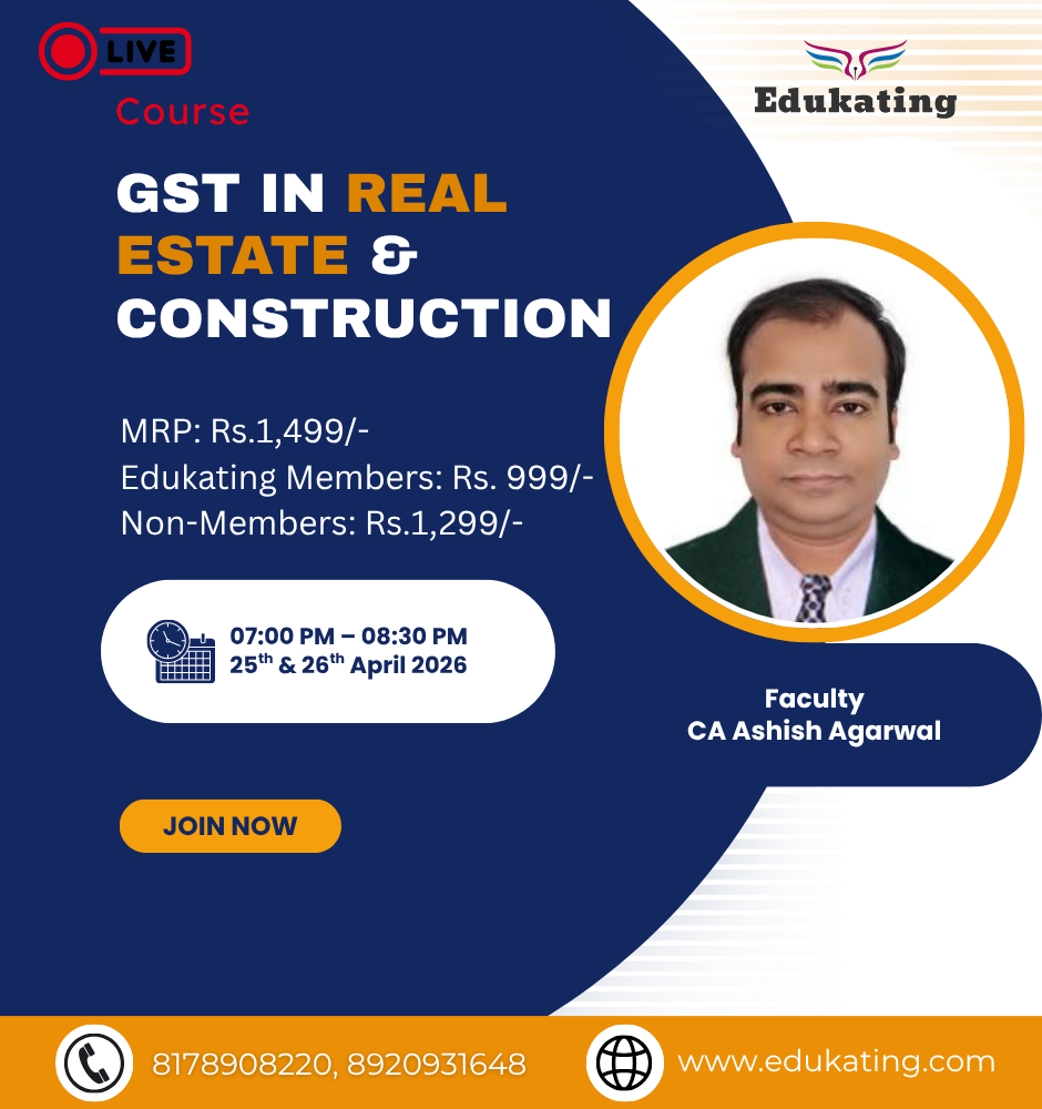 This live course provides a practical understanding of GST implications in the real estate and construction sector. It covers key concepts such as pre and post-GST taxation, classification, taxable events, valuation, ITC claim and reversal, place of supply, registration, tax rates, and exemptions. The session also includes an interactive Q&A to address real-world queries and challenges.