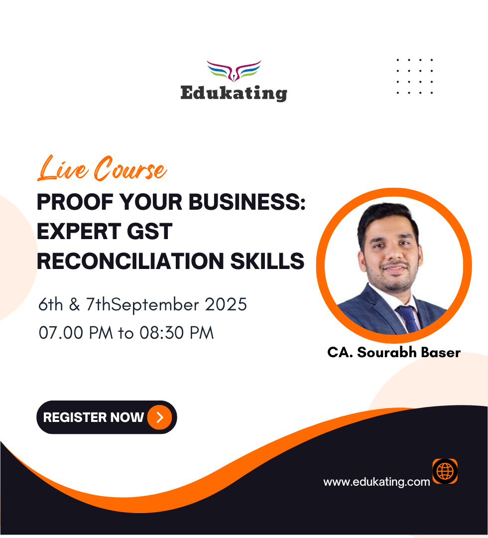 Strengthen your GST compliance with this power-packed live course led by CA Saurabh Baser. Over 2 days (6th & 7th Sept 2025, 7:00–8:30 PM), gain practical insights into accurate GST return reconciliation, ITC adjustments, mismatch corrections, and tax audit readiness.