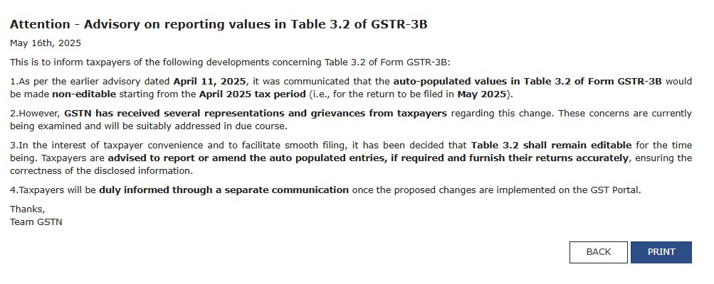 1.As per the earlier advisory dated April 11, 2025, it was communicated that the auto-populated values in Table 3.2 of Form GSTR-3B would be made non-editable starting from the April 2025 tax period (i.e., for the return to be filed in May 2025).