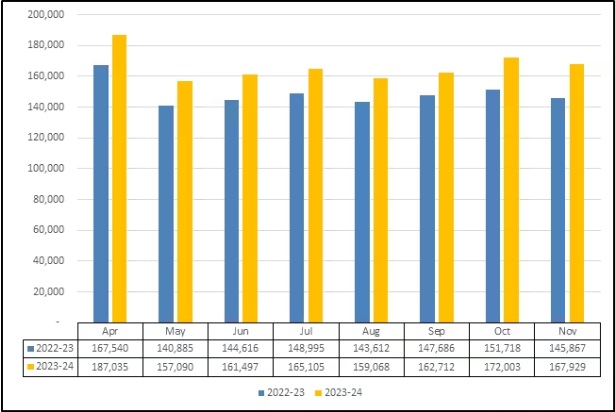 As per the latest data for November, released on December 1, GST collections have stayed above above the Rs 1.5-lakh-crore mark for nine consecutive months. The data for November also took the average monthly collection in 2023-24 to Rs 1.67 lakh crore, up from Rs 1.51 lakh crore in 2022-23, Rs 1.24 lakh crore in 2021-22, Rs 94,734 crore in 2020-21, Rs 1.02 lakh crore in 2019-20, Rs 98,114 crore in 2018-19 and Rs 89,885 crore in 2017-18.